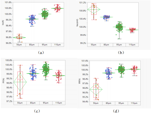 As wafers become thinner, light absorption decreases—does this reduce efficiency? The experiments results, consistent with findings in industry literature, reveal an interesting "seesaw" relationship: while short-circuit current (Jsc) decreases with wafer thinning, open-circuit voltage (Voc) increases. The fill factor (FF) remains relatively constant. Within a specific "plateau" phase, the overall cell efficiency decline is minimal and acceptable. The width of this plateau varies across different cell technologies. For Risen Energy, HJT Hyper-ion cells manufactured with 110 μm wafers have already achieved an average efficiency of 26.4%, with the best production batches exceeding 26.6%. These results demonstrate that, for HJT technology, proper wafer thinning does not compromise the upper limit of performance.