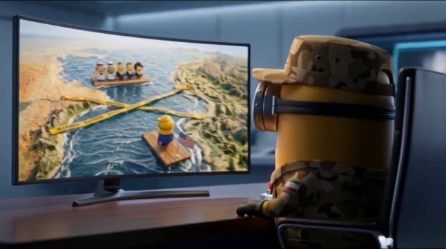 Nothing happens,but on another floating piece of wood,minions meant to represent leaders from Qatar,the UAE,Britain,France and Japan begin cheering.