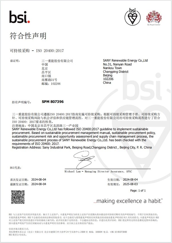 SHANGHAI,Aug. 26,2024 -- Sany Renewable Energy Co.,Ltd.,a trailblazer in the wind power sector,has achieved a significant milestone by securing validation from the British Standards Institution (BSI). The recognition makes it the first in the industry to receive the ISO 20400 Sustainable Procurement Compliance Statement. BSI,a leading global authority in standards and quality for products,services,and systems,recognizes companies that integrate sustainable procurement practices into their operations,setting a global benchmark for sustainable development.