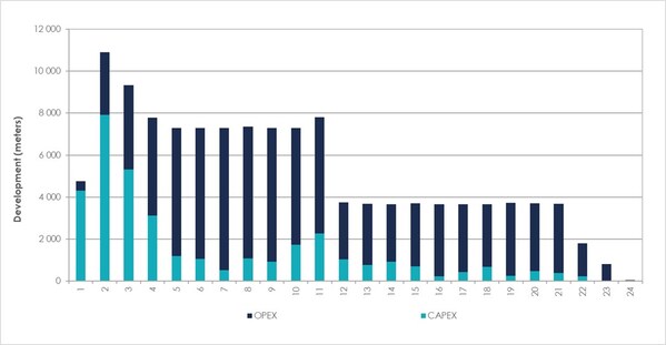 The PEA demonstrates the potential for robust economics,highlighted by a combined after-tax NPV8% of $2.9 billion (US$2.2 billion) and after-tax IRR of 34%. The Project's mine life is projected at 24 years,based on a total extracted Mineral Resource of 66% of total resources defined at CV5,generating significant net cash flows with capital payback achieved in 3.6 years.