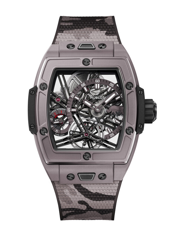 The Hublot Spirit of Big Bang SORAI is the fourth watch created in support of SORAI,and the first Spirit of Big Bang. Its 42mm case is cast in the same micro-blasted and polished "warm grey" ceramic created by Hublot for SORAI to capture the distinctive colour of a rhino's skin and first seen in the Big Bang Unico SORAI 2023. The watch is set on a grey fabric strap and supplied with a second strap in black rubber with a striking grey and beige camouflage pattern. Powering the watch is the HUB6020 Manufacture calibre,a hand-wound,skeletonised tourbillon with a five-day power reserve. It provides the watch with an asymmetrical display that sits poised between two sapphire crystals and that delicately balances a time display at 3 o'clock and a power reserve indicator between 8 and 9 o'clock. The Spirit of Big Bang SORAI will be limited to 30 pieces.