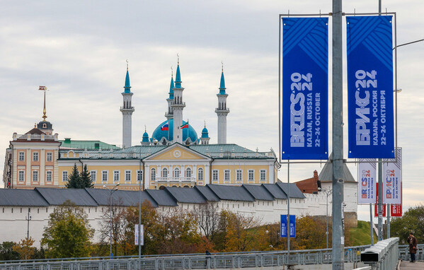 A view shows a banner with the logo of the annual BRICS summit next to the Kazan Kremlin in Kazan,Russia on Oct 22. [Photo/Agencies]