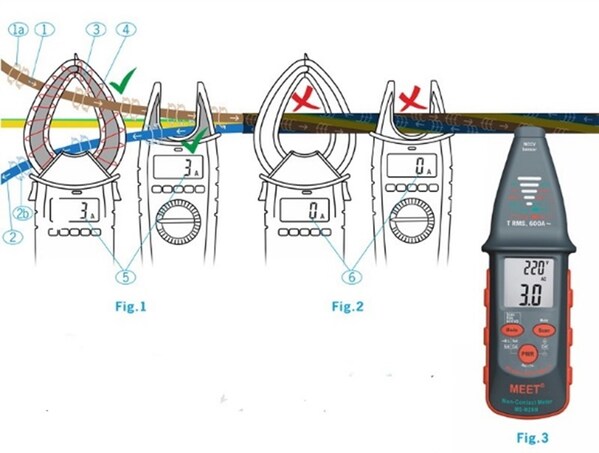 This is shown in Figure 2. The reason is the two different directions of current flows (1) and (2) generate the magnetic field: one clockwise (1a) and the other counterclockwise (2b). These two magnetic fields cancel each other out,and thus the induced voltage is transferred to 0 (6),which occasionally shows some reading based on leakage or unbalanced current. Additionally,measuring AC voltage on the cables with the non-contact method is also impossible. However,measuring on two-,three-,four-,or five-core cables even on shielded cables as well as on any length of cable has been impossible (Figure 2).