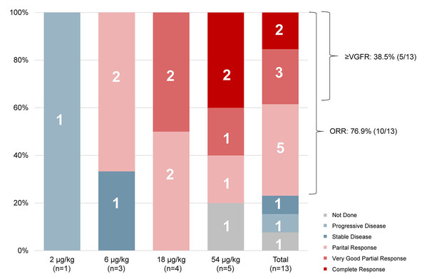 As of August 31,2024,a total of 13 patients had been enrolled in the trial. The median age among these participants was 61 years,and they had undergone a median of 3 prior lines of therapy (range,1 to 8). Notably,76.9% of the patients had received at least triple therapy,which included proteasome inhibitors,immunomodulators,and anti-CD38 monoclonal antibodies. Additionally,23.1% of the participants had been treated with B-cell maturation antigen (BCMA) chimeric antigen receptor T-cell (CAR-T) therapy.
