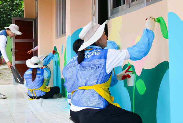 The KT&G Social Welfare foundation's "SangSang Withus" college stu dent volunteer group visits Indonesia,painting a mural for an Indones ian school.