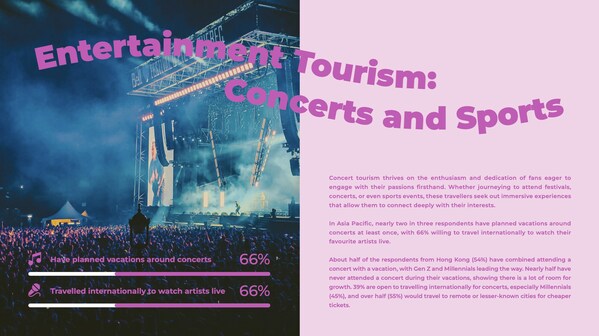 Entertainment-driven travel is set to soar,with concerts and sporting events becoming major travel motivators in 2025. Following the global phenomenon of Taylor Swift'sEras Tour in 2024,which drew record-breaking crowds worldwide,nearly two-thirds (66%) of travellers now plan to organise trips around live events. This trend isn't just local—66% have already travelled internationally to watch their favourite artists perform,turning concerts into full-fledged travel experiences.