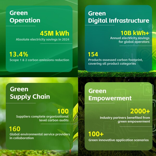 For Green Operation,ZTE has developed green smart campuses to achieve low-carbon development through eco-friendly office practices,research and development,and green manufacturing. In 2024,the company implemented several energy-saving and emission-reduction initiatives,resulting in an absolute electricity savings of 45 million kWh and an 13.4% year-over-year reduction in Scope 1 & 2 carbon emissions. Additionally,ZTE's photovoltaic systems generated 30 million kWh of electricity annually. Its self-developed ''Carbon Visibility App'' covers 83% of major carbon emission categories and data.