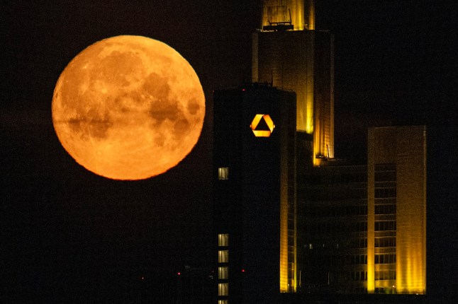 Last night’s moon seen behind the headquarters of Commerzbank bank in Frankfurt am Main,western Germany (Picture: AFP)