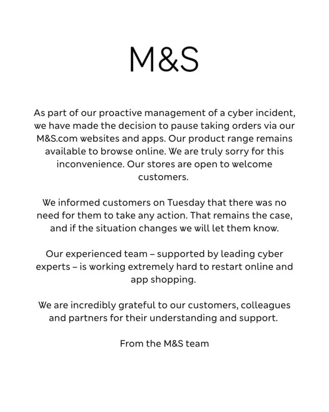 ‘We continue to manage the incident proactively and the M&S team – supported by leading experts – is working extremely hard to restore online operations and continue to serve customers well.