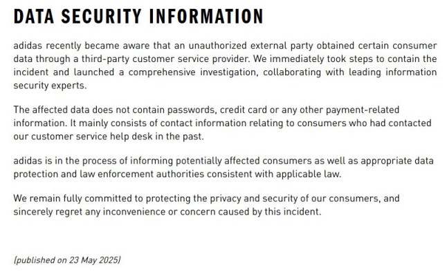 A statement on the Adidas website said: ‘Adidas recently became aware that an unauthorised external party obtained certain consumer data through a third-party customer service provider.