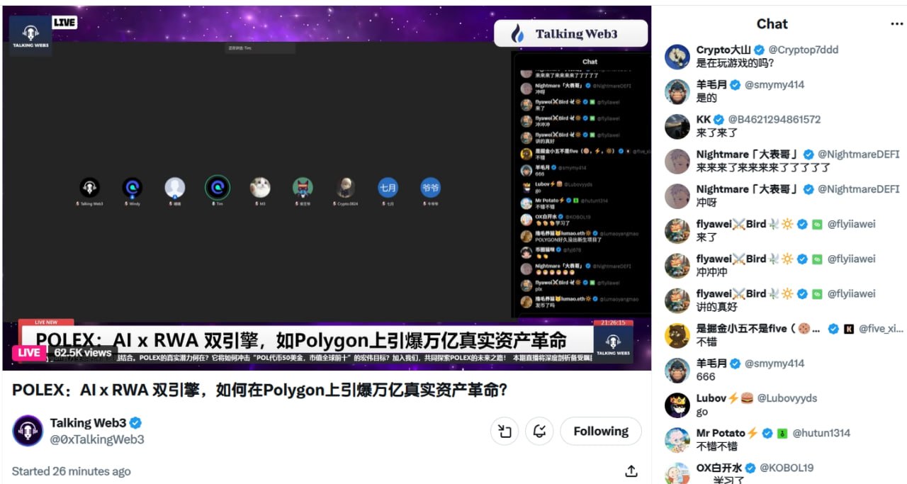 The Space event garnered up to 62,000 views on the main Twitter platform and was simultaneously streamed to eight major platforms including Binance Live, Huobi Live, YouTube, and TikTok, with total viewership surpassing 100,000+. The community interaction during the live stream was enthusiastic, fully demonstrating the POLEX project's powerful appeal and market potential in the combined AI and RWA track.