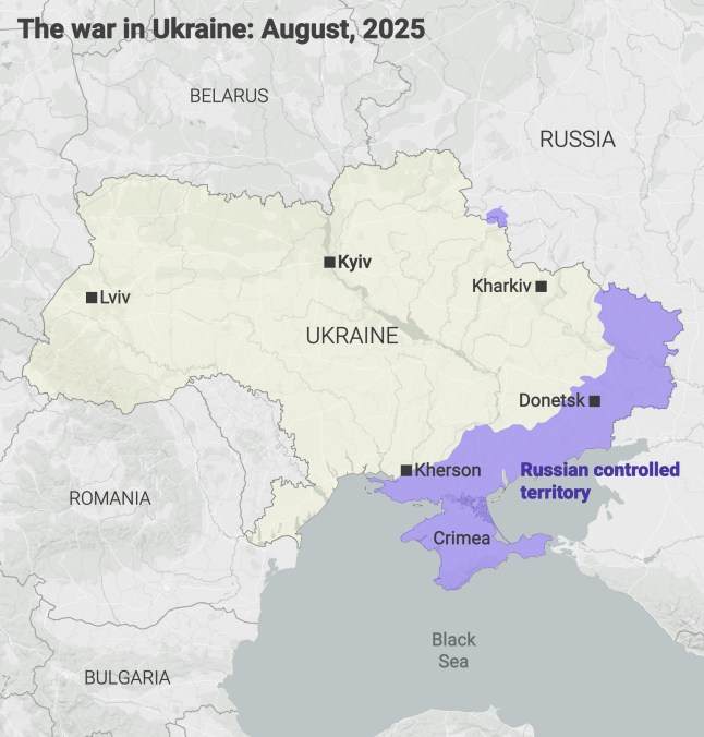 The purple areas of Ukraine are currently controlled by Russia,and the hatched areas are land Russia wants Ukraine to cede in order to consider a ceasefire (Picture: Metro Graphics)