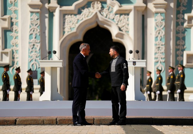 Canadian PM Mark Carney,left,and Ukrainian president Volodymyr Zelensky shake hands as they take part in a ceremony on Independence Day in Sophia Square in Kyiv (Picture: AP)